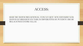 Access es un software de base de datos relacional donde los datos se almacenan en tablas relacionadas entre sí. Ofrece funciones como consultas SQL, formularios y reportes. Es fácil de usar y se integra bien con otros programas de Office. Sin embargo, tiene limitaciones como un máximo de 1GB por tabla y solo es compatible con Windows.