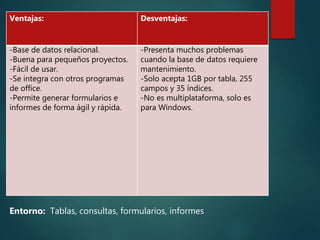 Access es una base de datos relacional que permite crear tablas, consultas, formularios e informes relacionados. Ofrece ventajas como su facilidad de uso y integración con otros programas de Office, pero tiene limitaciones como su capacidad máxima de 1GB por tabla. Los objetos principales de una base de datos en Access son las tablas para almacenar datos, consultas para obtener información de forma selectiva, formularios para gestionar datos de forma más cómoda y los informes para preparar registros de datos de forma personalizada.