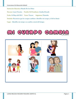 El documento habla sobre la licenciatura en educación infantil de Laura Melissa Vizcaino Vizcaino. Describe las diferentes páginas del trabajo de Laura que incluyen un resumen de Caperucita Roja y las funciones clave de un educador infantil como detectar problemas, elaborar programas educativos, liderar proyectos, promover estrategias pedagógicas, ofrecer ayuda familiar y organizar eventos recreativos.