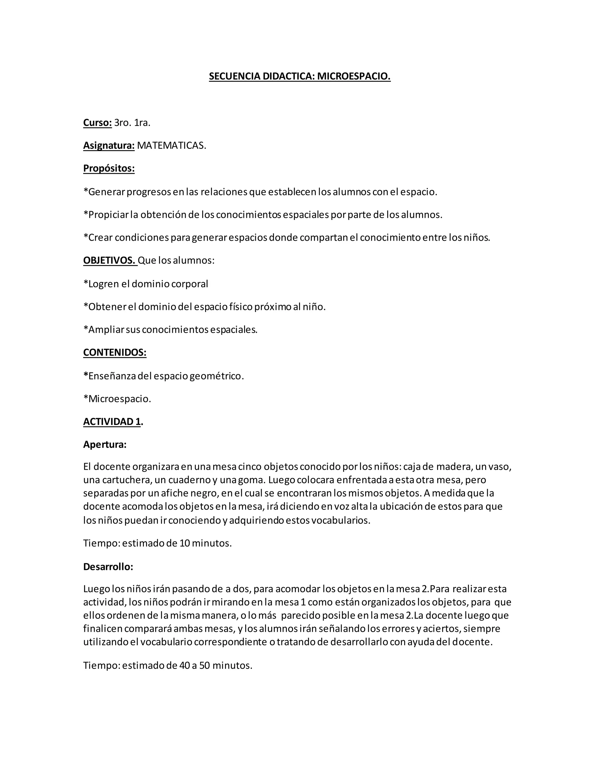 El documento presenta una secuencia didáctica sobre el microespacio para alumnos de 3er grado. Consta de tres actividades que buscan que los alumnos dominen el espacio físico próximo y amplíen sus conocimientos espaciales a través del vocabulario y la manipulación de objetos. Las actividades involucran ordenar y reordenar objetos en mesas separadas para desarrollar nociones espaciales como cerca, lejos, delante, atrás, etc.