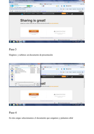 El documento proporciona 6 pasos para insertar un SlideShare en un blog: 1) Buscar cómo insertar un SlideShare, 2) Registrarse en SlideShare o cargar un documento existente, 3) Seleccionar y cargar un documento de presentación, 4) Abrir el documento cargado en la biblioteca, 5) Copiar el código HTML de SlideShare y pegarlo en la página del blog, y 6) Publicar la actualización del blog para compartir el SlideShare.