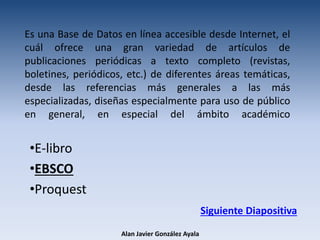 Una base de datos en línea accesible desde Internet que ofrece una gran variedad de artículos de publicaciones periódicas a texto completo de diferentes áreas temáticas, desde las referencias más generales a las más especializadas, diseñadas especialmente para uso del público en general, en especial del ámbito académico.