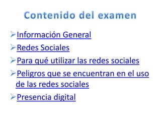 Las redes sociales permiten comunicarse e intercambiar información de forma instantánea entre usuarios. Sin embargo, también conllevan riesgos como la pérdida de privacidad al compartir datos personales, el acceso a contenidos inadecuados y el acoso cibernético. Para un uso seguro de las redes sociales, es importante configurar adecuadamente la privacidad y evitar compartir información personal.