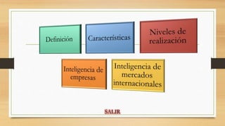 El documento define la inteligencia de negocios como el conjunto de estrategias y aspectos relevantes enfocadas a la administración y creación de conocimiento sobre el medio a través del análisis de datos en una organización. Describe sus características principales como la accesibilidad, el apoyo en la toma de decisiones y la orientación al usuario final. Explica que los datos son la fuente principal y que las herramientas deben garantizar el acceso de los usuarios a los datos con independencia de su procedencia.