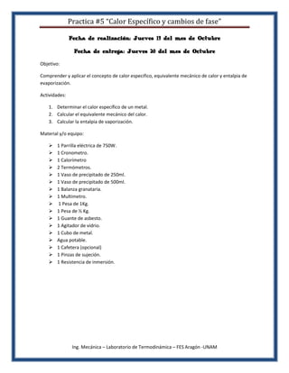 Este documento presenta los objetivos, materiales, aspectos teóricos y desarrollo de una práctica de laboratorio sobre calor específico y cambios de fase. La práctica consiste en tres actividades: 1) determinar el calor específico de un metal, 2) calcular el equivalente mecánico del calor utilizado, y 3) calcular la entalpía de vaporización. Se proporcionan tablas para registrar las lecturas y cálculos realizados durante cada actividad.