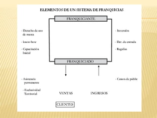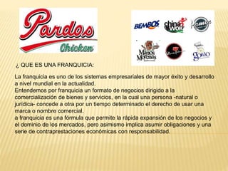 Este documento describe la franquicia Pardo's Chicken. Explica que una franquicia es un formato de negocio donde una empresa concede a otra el derecho de usar su marca y métodos comerciales. Luego detalla los beneficios de una franquicia para Pardo's Chicken, sus objetivos, y los roles del franquiciante, franquiciado, marca y conocimientos. También cubre aspectos como costos, expansión histórica, requisitos para franquiciados y posicionamiento de la marca. El objetivo general es promover la franquicia de Pardo's