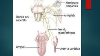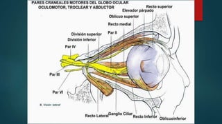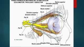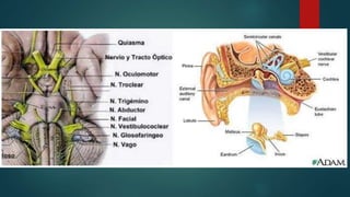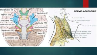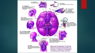 El documento detalla los 12 pares de nervios craneales, sus funciones y destinos relacionados con la inervación de la cabeza, cuello y vísceras. Se clasifican en nervios sensitivos, motores y mixtos, cada uno con funciones específicas como la visión, el olfato, el equilibrio y el movimiento facial. También se describe cómo estos nervios interactúan con diferentes estructuras del cuerpo humano.