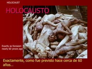El documento describe cómo el general Dwight D. Eisenhower ordenó que se tomaran fotografías y películas de los campos de concentración nazis para documentar el Holocausto, anticipando que en el futuro podrían negar que sucedió. También advierte sobre el peligro de que se olvide el Holocausto y se niegue, a la luz de que algunos países como el Reino Unido han eliminado su enseñanza para no ofender a los musulmanes. Finalmente, pide que se comparta el mensaje para recordar a las víctimas y advertir sobre la