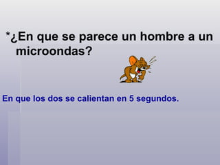 Este documento contiene una serie de chistes y bromas que comparan estereotípicamente a los hombres con objetos y situaciones de manera negativa y ofensiva. Los chistes sugieren que los hombres son tontos, perezosos, inútiles para las tareas domésticas y la crianza de los hijos, y que solo piensan en sexo.