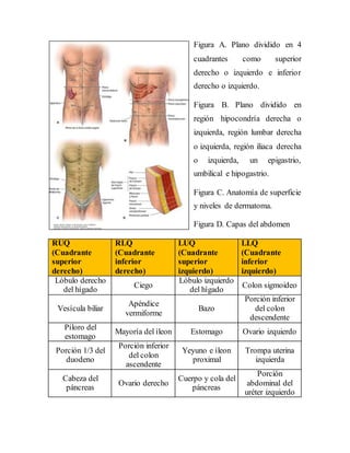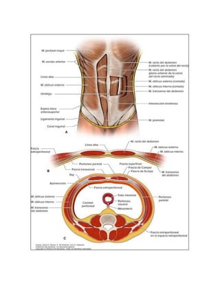 El documento describe la anatomía de la pared abdominal. La pared abdominal está formada por músculos que dividen el abdomen en cuatro cuadrantes y nueve regiones. Se describen los músculos oblicuos externos e internos, el músculo transverso del abdomen, y los músculos rectos del abdomen. También se detallan los músculos de la pared abdominal posterior como el psoas mayor, el iliaco y el cuadrado lumbar. Finalmente, se explica la vascularización e inervación de la pared abdominal.