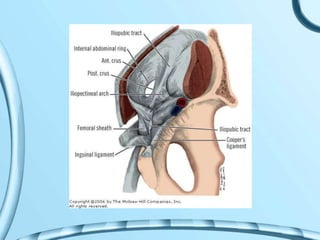 Este documento describe la pared abdominal y el conducto inguinal. Describe los límites, contenido y divisiones de la pared abdominal, así como los planos anatómicos, irrigación, drenaje y inervación de la pared abdominal anterior y lateral. También describe el desarrollo, contenido y paredes del conducto inguinal, incluido el triángulo de Hesselbach, y explica las hernias inguinales directa e indirecta.