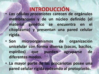 La pared celular mantiene la forma de la célula y evita su lisis osmótica, regula el intercambio con el exterior, proporciona carga negativa a la superficie celular y tiene propiedades antigénicas. Las bacterias se dividen en Gram positivas y Gram negativas dependiendo de si su pared celular contiene una o dos membranas, respectivamente. La pared de las Gram positivas es más gruesa y contiene mayor cantidad de peptidoglicano, mientras que la de las Gram negativas es más delgada y comple