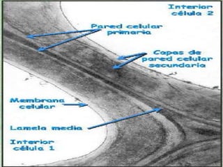 La pared celular protege y da forma a las células de plantas, bacterias y hongos. En plantas, está compuesta principalmente de celulosa, hemicelulosa y pectina. En bacterias, el componente principal es el peptidoglucano. Y en hongos, la quitina provee estructura y soporte. Las paredes cumplen funciones vitales como protección, soporte mecánico y regulación del intercambio de sustancias.