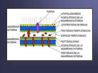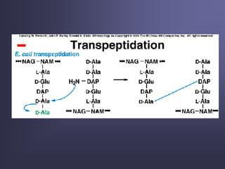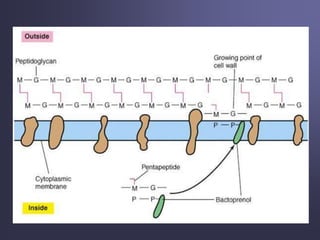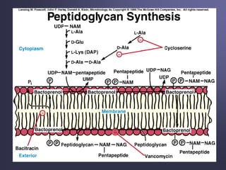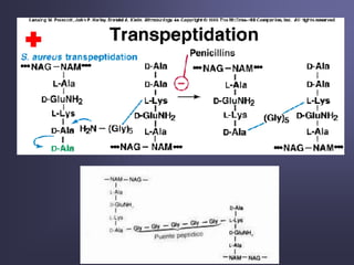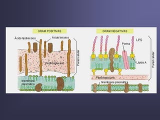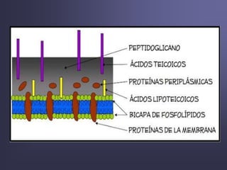 La pared celular bacteriana está compuesta principalmente de peptidoglicano. En bacterias Gram positivas, el peptidoglicano contiene L-lisina, mientras que en bacterias Gram negativas contiene meso-diaminopimélico. Las bacterias Gram positivas son resistentes al alcohol, mientras que las Gram negativas contienen lipopolisacárido. Diferentes antibióticos como los β-lactámicos, penicilinas y aminoglucósidos actúan sobre la pared celular bacteriana mediante diferentes mecanismos