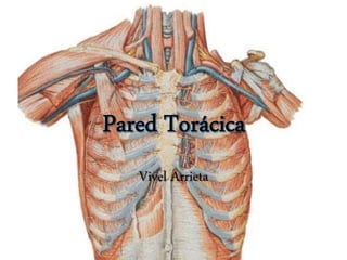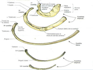 El documento describe la anatomía del tórax, incluyendo los huesos (costillas y esternón), articulaciones, músculos, vasos sanguíneos y nervios. El tórax está formado por la caja torácica, que contiene los pulmones y el corazón, y está protegido por 12 pares de costillas y el esternón unidos por cartílagos costales. Los músculos intercostales ayudan a la respiración al elevar y expandir la caja torácica. Los nervios y vasos sanguí