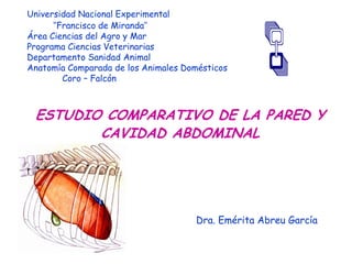 Este documento presenta una comparación de la anatomía de la pared abdominal y el estómago de varias especies animales domésticas. Describe las diferencias en las estructuras óseas, nerviosas y musculares de la pared abdominal del bovino, equino, porcino, canino y caprino. También compara la forma, tamaño, posición y partes del estómago en estas especies, destacando las diferencias en la anatomía gástrica entre los rumiantes y no rumiantes. El objetivo es familiarizar a los estudiantes con los
