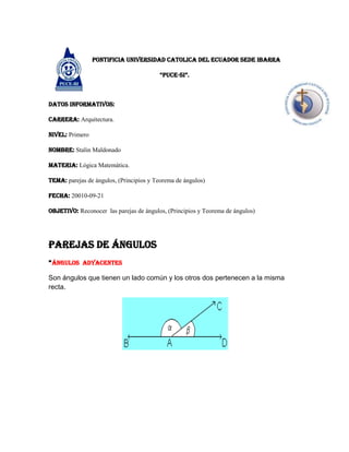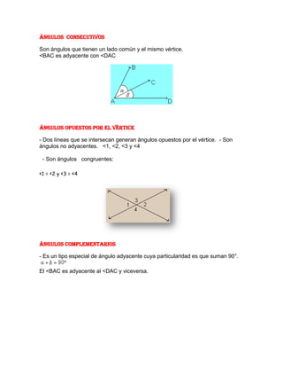 El documento describe diferentes tipos de ángulos y teoremas relacionados con ángulos. Explica que los ángulos adyacentes comparten un lado y los ángulos consecutivos comparten un vértice. También describe ángulos opuestos por el vértice, complementarios y suplementarios. Finalmente, presenta algunos teoremas de ángulos como que los ángulos opuestos por el vértice son iguales y que todo ángulo inscrito en una semicircunferencia es recto.