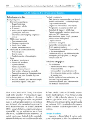 La nutrición parenteral consiste en la provisión de nutrientes a través de una vía intravenosa para cubrir los requerimientos metabólicos y de crecimiento de niños desnutridos o con riesgo de desnutrición debido a una enfermedad digestiva o extradigestiva. La nutrición parenteral puede ser total o parcial y está indicada para prevenir o corregir los efectos adversos de la malnutrición en pacientes que no pueden obtener nutrientes de forma oral o enteral por más de 5-7 días. La composición de la nutrición parent
