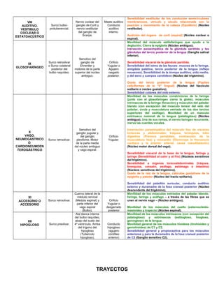 Este documento describe las 12 parejas craneales, incluyendo su origen aparente y real, agujero de salida, función y trayectos. Cada par craneal tiene una combinación única de funciones motoras, sensitivas y viscerales que inervan diferentes regiones de la cabeza y el cuello.