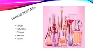 Este documento presenta una variedad de perfumes con diferentes aromas y precios. Incluye secciones sobre perfumes dulces, naturales, cítricos y splash con descripciones de sus ingredientes y precios entre $2,500-$10,000. También incluye una breve historia del perfume explicando que originalmente se usaban sustancias quemadas para sus aromas y ahora son líquidos aromáticos usados por hombres y mujeres.