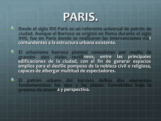 El documento describe brevemente la historia de la planificación urbana de París. Explica que durante el reinado de Enrique IV y María de Médicis se ampliaron las calles y plazas principales de la ciudad para crear espacios abiertos para desfiles y espectáculos. También menciona que una maqueta representa de manera abstracta el croquis de París con sus plazas y ejes viales principales.