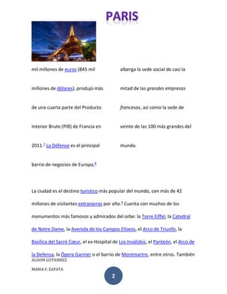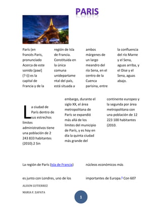 París es la capital y ciudad más grande de Francia. Está situada en el centro de Francia a orillas del río Sena. Es una importante ciudad económica y turística, con más de 2 millones de habitantes en la ciudad y 12 millones en el área metropolitana. Genera más de un cuarto del PIB francés y alberga importantes instituciones culturales como el Louvre y Notre Dame, así como la sede de grandes empresas.