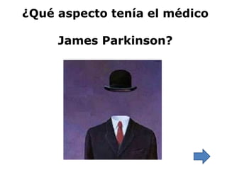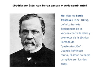 El documento presenta varias imágenes de médicos históricos y explica brevemente por qué ninguno de ellos es James Parkinson, el médico que descubrió la enfermedad de Parkinson. Aunque circulan imágenes de Parkinson en Internet, los expertos no pueden confirmar con certeza cuál es su verdadera apariencia.