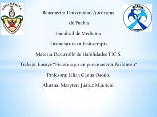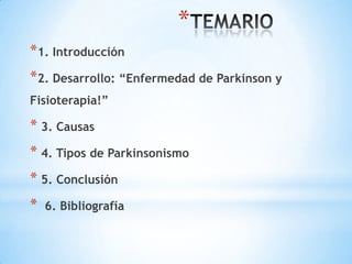 La enfermedad de Parkinson es una enfermedad neurodegenerativa causada por la muerte de neuronas en la sustancia negra del cerebro que producen dopamina. La fisioterapia es útil para esta enfermedad a través de ejercicios, magnetoterapia y otros tratamientos físicos que ayudan a mejorar la movilidad y función de los pacientes. Aunque no tiene cura, estos tratamientos pueden aliviar los síntomas y estabilizar la progresión de la enfermedad.