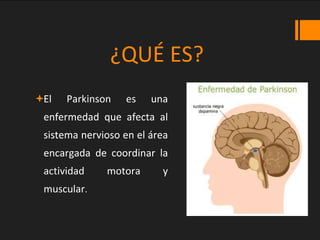 El Parkinson es una enfermedad neurodegenerativa que afecta el sistema nervioso y causa temblores, rigidez muscular y otros síntomas motores y no motores. Aunque no tiene una causa definida, factores como la herencia genética, virus, toxinas y el envejecimiento pueden contribuir al desarrollo de la enfermedad. El Parkinson se diagnostica clínicamente basado en los síntomas presentados por el paciente, y su tratamiento incluye medicamentos como la levodopa y la fisioterapia, aunque aún no existe una