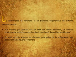 La enfermedad de Parkinson es un trastorno degenerativo del sistema nervioso central causado por la pérdida progresiva de neuronas que producen dopamina en la sustancia negra del cerebro, lo que reduce los niveles de dopamina y causa síntomas motores como temblor, rigidez y lentitud de movimiento. No tiene cura, pero los medicamentos como la levodopa pueden aliviar los síntomas al aumentar los niveles de dopamina en el cerebro. El tratamiento odontológico requiere consideraciones especiales debido a los