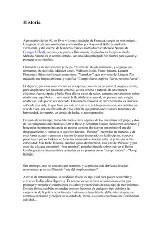El parkour es una disciplina que consiste en desplazarse de forma fluida y eficiente entre puntos usando las habilidades del cuerpo humano. Surgió en Francia en los años 90 como un método de entrenamiento físico y mental inspirado en el método natural. Aunque ha evolucionado con diferentes nombres como "arte del desplazamiento" o "free running", su filosofía central se basa en la autosuperación y el movimiento libre a través de saltos, carreras y equilibrios.
