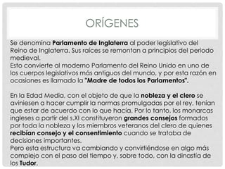 El Parlamento de Inglaterra, que tiene orígenes medievales y es considerado uno de los cuerpos legislativos más antiguos, comenzó a transformarse con la dinastía de los Tudor. Durante el reinado de Carlos I, la tensión entre el monarca y el parlamento llevó a conflictos que culminaron en la ejecución del rey y la creación de un gobierno republicano bajo Oliver Cromwell. Cromwell, quien se opuso a la restauración de la monarquía, finalmente disolvió el parlamento y asumió el poder como 'Lord Protector', aunque este gobierno fue efímero y se restableció la monarquía tras su muerte.