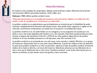 La parálisis cerebral es un grupo de trastornos motores causados por una lesión cerebral antes de los 5 años que afecta el control de los movimientos y la postura. Puede deberse a factores prenatales, perinatales o posnatales. Presenta diferentes tipos como espástico, atetoide o atáxico que se caracterizan por alteraciones del tono muscular. Requiere un tratamiento individualizado multidisciplinar que incluye fisioterapia, terapia ocupacional y en ocasiones cirugía o medicación.