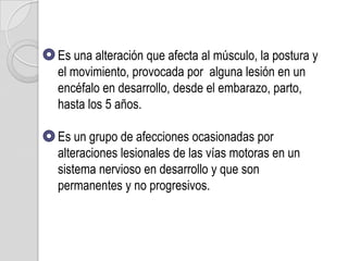 La parálisis cerebral (PC) es un trastorno del movimiento y la postura causado por una lesión cerebral antes de los 5 años. Puede afectar el habla, la alimentación y otras funciones orofaciales. Los niños con PC suelen tener dificultades con la articulación, la fonación y la comprensión del lenguaje, aunque estos aspectos pueden variar entre individuos. El pronóstico depende de factores como el acceso a recursos terapéuticos y nutricionales, que a su vez están influenciados por la situación
