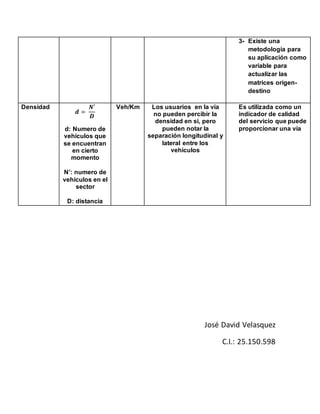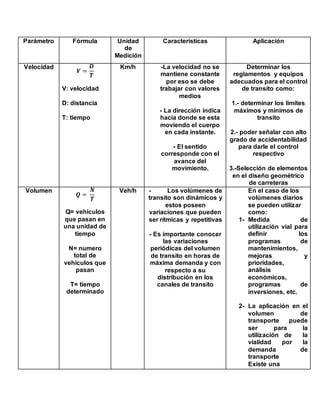 Este documento describe parámetros como velocidad, volumen y densidad que se usan para medir el tráfico. Define las fórmulas, unidades y aplicaciones de cada parámetro. La velocidad se mide en km/h y se usa para regular el tráfico. El volumen se mide en vehículos por hora y ayuda a planificar el mantenimiento vial. La densidad se mide en vehículos por km y indica la calidad del servicio en una vía.