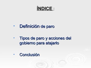Este documento describe los tipos de desempleo en España. Define el desempleo como la población activa que no tiene trabajo. Explica que hay cuatro tipos principales: paro friccional causado por rotación laboral, paro estructural por desajuste entre oferta y demanda, paro cíclico debido a la fase descendente del ciclo económico, y paro estacional por dependencia del turismo. El gobierno intenta abordar esto mejorando la información laboral, formación profesional, políticas económicas y foment