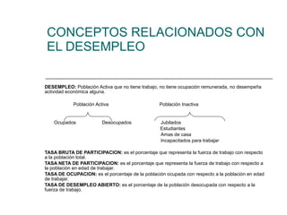 Este documento resume conceptos clave relacionados con el desempleo en España, incluyendo tasas de desempleo, tipos de desempleo, evolución del desempleo en España y tasas de desempleo por sector económico, sexo y grupo de edad. Concluye que la tasa de desempleo en España alcanzará el 19.4% en el primer trimestre de 2010, con 4.5 millones de desempleados, y que España tendrá el mayor incremento de desempleo juvenil y adulto comparado con otros países europeos.