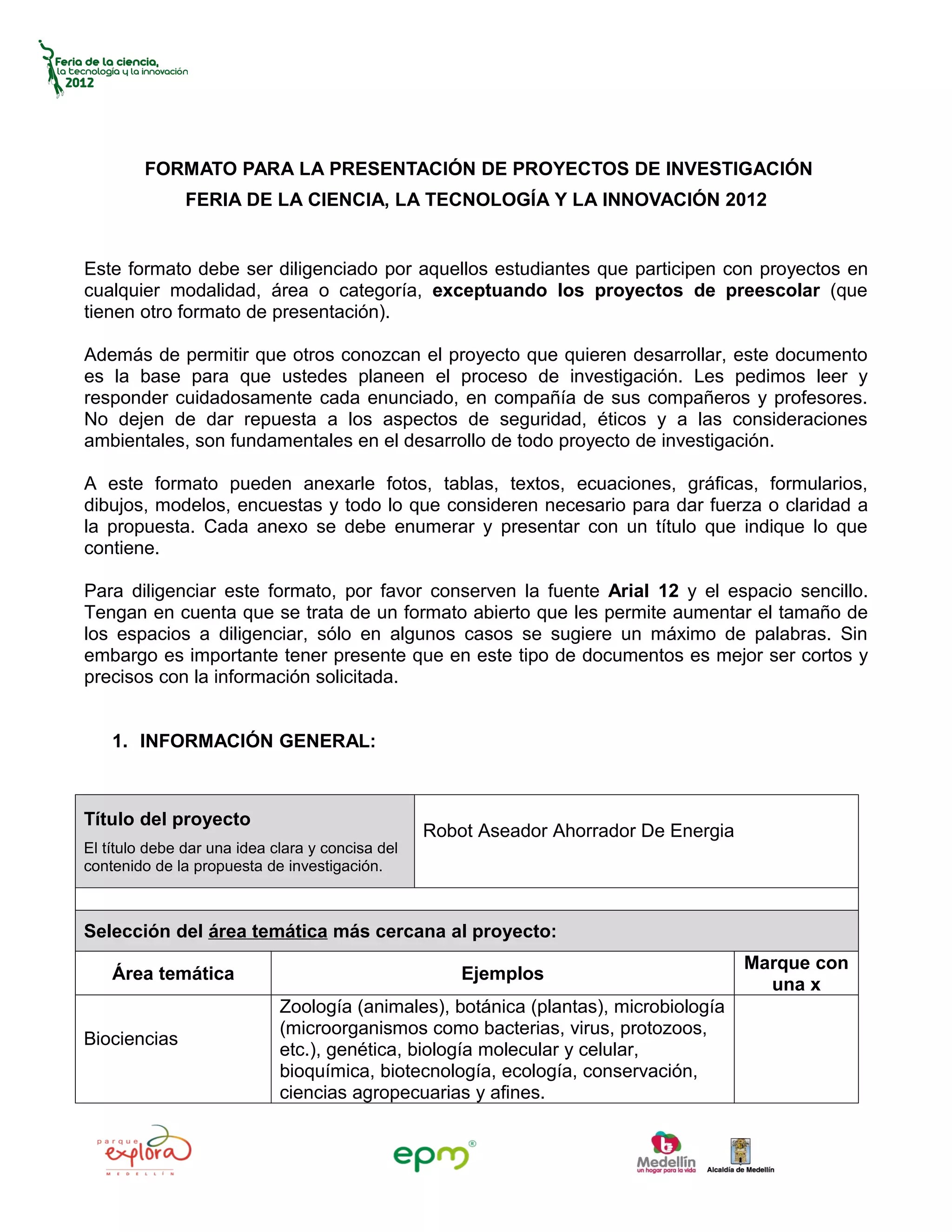 Este documento presenta un formato para la presentación de proyectos de investigación en la Feria de la Ciencia, la Tecnología y la Innovación de 2012. El formato debe ser diligenciado por estudiantes que participen con proyectos en cualquier área o categoría, exceptuando proyectos de preescolar. El formato solicita información general sobre el proyecto, como el título, área temática, objetivos e investigadores; y provee lineamientos sobre su descripción, planteamiento del problema y marco teórico.