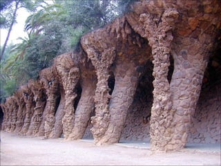 El Parque Güell fue diseñado por Antoni Gaudí en 1903 como una urbanización de lujo encargada por Eusebi Güell que finalmente se convirtió en un parque público. El parque contiene estructuras de piedra y cerámica notables como la sala hipóstila con 86 columnas que sostienen una plaza, bancos de colores vivos y la cueva del elefante. El parque transmite la influencia de la naturaleza a través de sus formas y está considerado un lugar mágico lleno de sorpresas