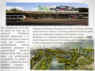 El Parque del Este en Caracas fue inaugurado en 1961 por el presidente Rómulo Betancourt y diseñado por el arquitecto paisajista brasileño Roberto Burle Marx. Con más de 75 hectáreas, es el segundo parque más grande de Caracas y es visitado diariamente. El parque cuenta con lagos, jardines xerófilos e hidrófilos, y un bosque tropical húmedo con una gran variedad de árboles y plantas acuáticas.