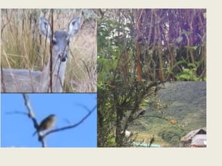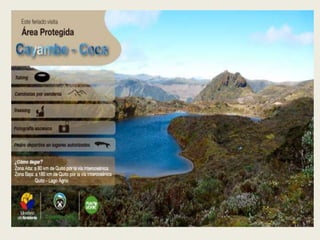 El documento describe el objetivo de estudiar la fauna vertebrada del Parque Nacional Cayambe-Coca en Ecuador. Los objetivos específicos son establecer qué especies de reptiles, anfibios, mamíferos o aves se observan con mayor frecuencia en el parque, identificar los sectores con mayor número de avistamientos de fauna vertebrada representativa, e identificar problemas que afectan a su conservación. También busca verificar la especie símbolo del parque y determinar su fauna vertebrada más representativa.