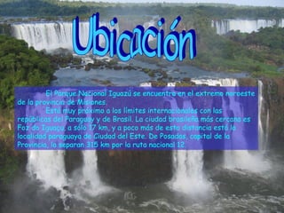 El Parque Nacional Iguazú se encuentra en el extremo noroeste de la provincia de Misiones, Argentina, con temperaturas entre 15°C y 30°C. La mejor época para visitar las cataratas es durante la estación de lluvias de enero a marzo, cuando el caudal de agua es mayor. El parque ofrece turismo de aventura como trekking en el bosque, vuelos de canopy entre los árboles, y rafting en el río.