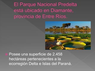 Este documento describe un área de 2,458 hectáreas perteneciente a la ecorregión Delta e Islas del Paraná. El río Paraná aporta sedimentos que forman las islas en esta región del oeste de Entre Ríos, Argentina. El clima es templado húmedo con temperaturas entre 13°C y 23°C y entre 800 y 1,020 mm de lluvia anual. La fauna incluye palomas, chajás, patos, garzas, cigüeñas y varios mamíferos. En el agua hay peces como