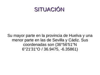 El Parque Natural de Doñana se encuentra en las provincias de Huelva, Sevilla y Cádiz en España. Se extiende por varios municipios y alberga especies en peligro como el lince ibérico, la anguila, la tortuga boba y aves como la garceta común. Algunas plantas notables son el pino piñonero, la jara blanca y el enebro.