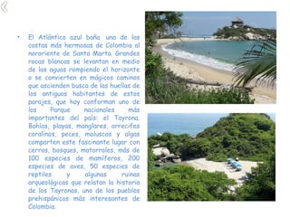 El Parque Nacional Natural Tayrona en Colombia se extiende desde el nivel del mar hasta los 900 metros de altura, lo que permite una gran variedad de ecosistemas terrestres y marinos con más de 100 especies de mamíferos, 200 de aves y 50 de reptiles. Dentro del parque se encuentra la cultura indígena Tayrona y los restos arqueológicos de su antigua "Ciudad Pérdida", que comprende un complejo sistema de construcciones y terrazas que ocupa un área de aproximadamente 200 hectáreas. El Par