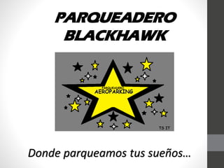 El documento presenta la misión, visión, valores y objetivos de la empresa de parqueaderos Blackhawk. Su misión es ofrecer servicios de lavado y parqueo de vehículos en puntos estratégicos de la ciudad así como salones para eventos. Su visión para el 2020 es contar con varias sucursales a nivel nacional y más servicios para autos. Su lema es "Donde parqueamos tus sueños" y sus valores incluyen el respeto, orden y educación con los clientes. Sus objetivos principales son ofrecer un agradable servicio para