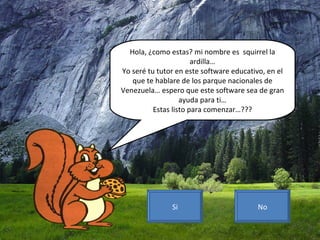 Este documento presenta información sobre varios parques nacionales de Venezuela. Explica brevemente la ubicación, clima, vegetación y fauna de cada parque seleccionado, así como formas de llegar a ellos. El tutor virtual guía al usuario a través de la selección de un estado y un parque en particular para obtener más detalles sobre ese espacio protegido.
