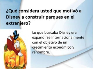 Disney construyó parques en el extranjero para expandirse internacionalmente y lograr un crecimiento económico. Eligió París por su ubicación central y Asia por su gran población con altos ingresos. Realizó inversiones grandes en Francia y Hong Kong debido al éxito previo y para facilitar el acceso, aunque tuvo problemas con la cultura francesa y el clima afectó al parque de París. No invirtió en Japón por falta de estudios, pero Shanghái es una buena opción por su mercado y a