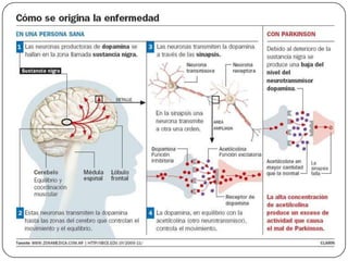 El mal de Parkinson es un trastorno cerebral que causa problemas de movimiento como temblores, rigidez y dificultad para caminar. Presenta varios síntomas que incluyen disminución del movimiento, trastornos digestivos, depresivos, urinarios y oculares. Se trata con cirugía, medicamentos, terapia del habla y cambios en el estilo de vida como ejercicio y descanso.