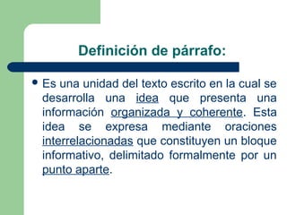 Este documento define el párrafo como la unidad del texto escrito que desarrolla una idea de manera organizada y coherente. Explica que un párrafo contiene generalmente una oración temática, oraciones de desarrollo y una oración de cierre. Además, clasifica los párrafos en introductorios, de desarrollo y conclusivos, e identifica diferentes tipos dentro de cada categoría.